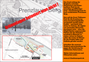 Das Gelände des Ernst-Thälmann-Parks ist ein einzigartiges städtebauliches Ensemble, welches durch die geplante Schulerweiterung und Wegeschließung in zwei Teile zerschnitten, in der Mitte blockiert und verkleinert werden würde. Der Park Teil mit dem Planetarium als zentrales Denkmal würde dann in kürzester Zeit völlig übernutzt werden; das gleiche Schicksal droht dann auch dem Parkgelände hinter dem Ernst-Thälmann-Denkmal. Die geplanten Neubauwohnungen auf dem Vivantes Klinikgelände verschärfen dann noch bei Realisierung die Übernutzung der Parkanlagen; und zusätzliche Schulbedarfe kommen dann auch noch hinzu. Eine lustige Spirale… Wer hat sich diese Pläne nur ausgedacht?