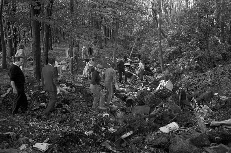 1974: Stadtpräsident Eckhard Sauerbaum (Bildmitte im Trainingsanzug mit Streifen an den Ärmeln und Hose) entrümpelt mit Helfern ein Waldstück am Timmerberg. Auch im Stadtforst Hammer, am Kuckucksberg und am Tröndelsee sammeln Kieler Kommunalpolitiker anlässlich des Umweltschutztages Müll ein. CC BY-SA 3.0 DE – Das waren noch Zeiten, als die Politiker den Müll gesammelt haben …