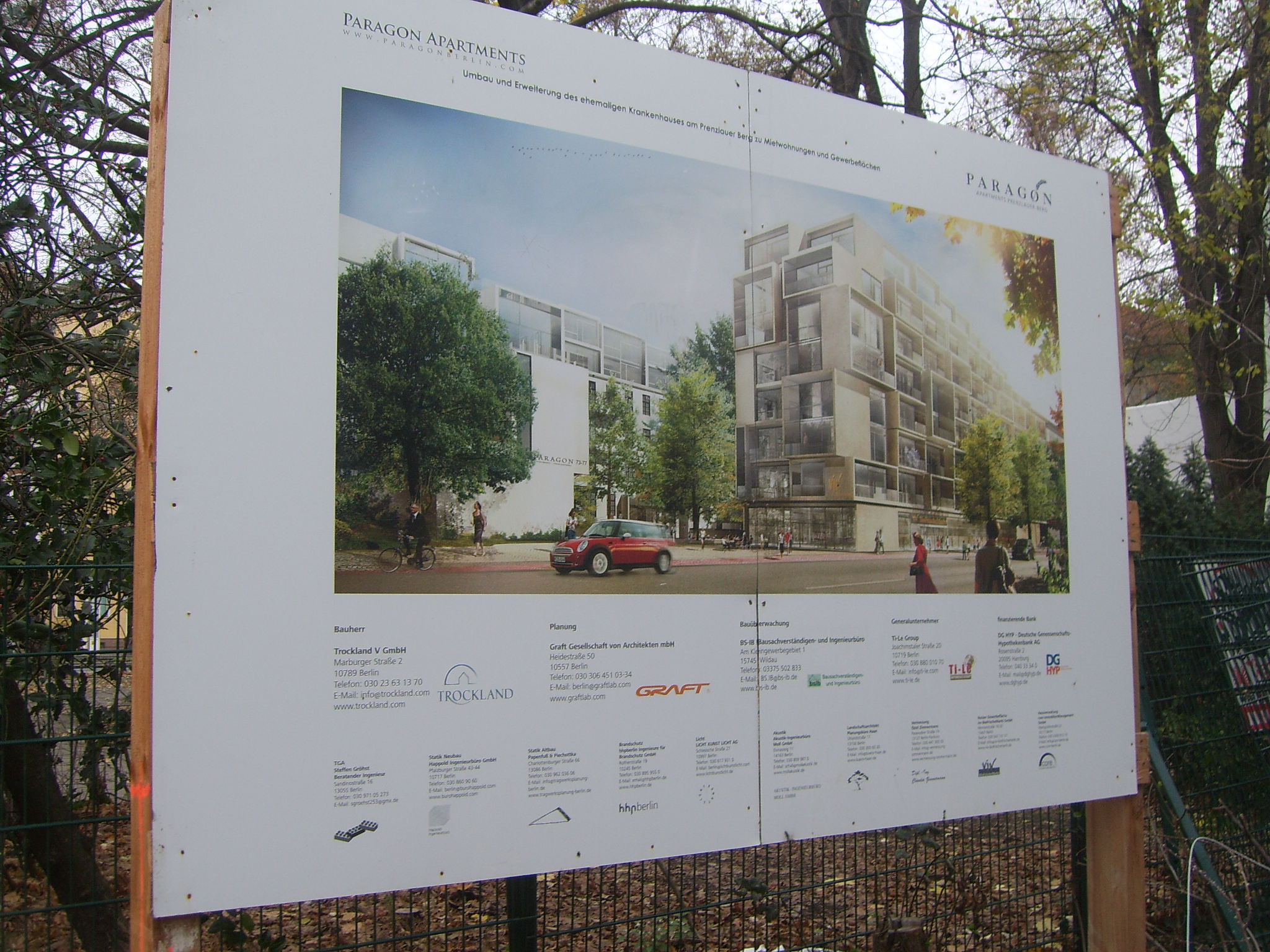 An der Ecke Danziger Straße/Prenzlauer Allee entsteht jetzt das fetteste Bauvorhaben: die „PARAGON APARTMENTS – PRENZLAUER BERG“. Hier hat man sich das Gelände und die Bausubstanz des alten Prenzlauer Berg- Krankenhaus unter den Nagel gerissen. Wie Randbebauung