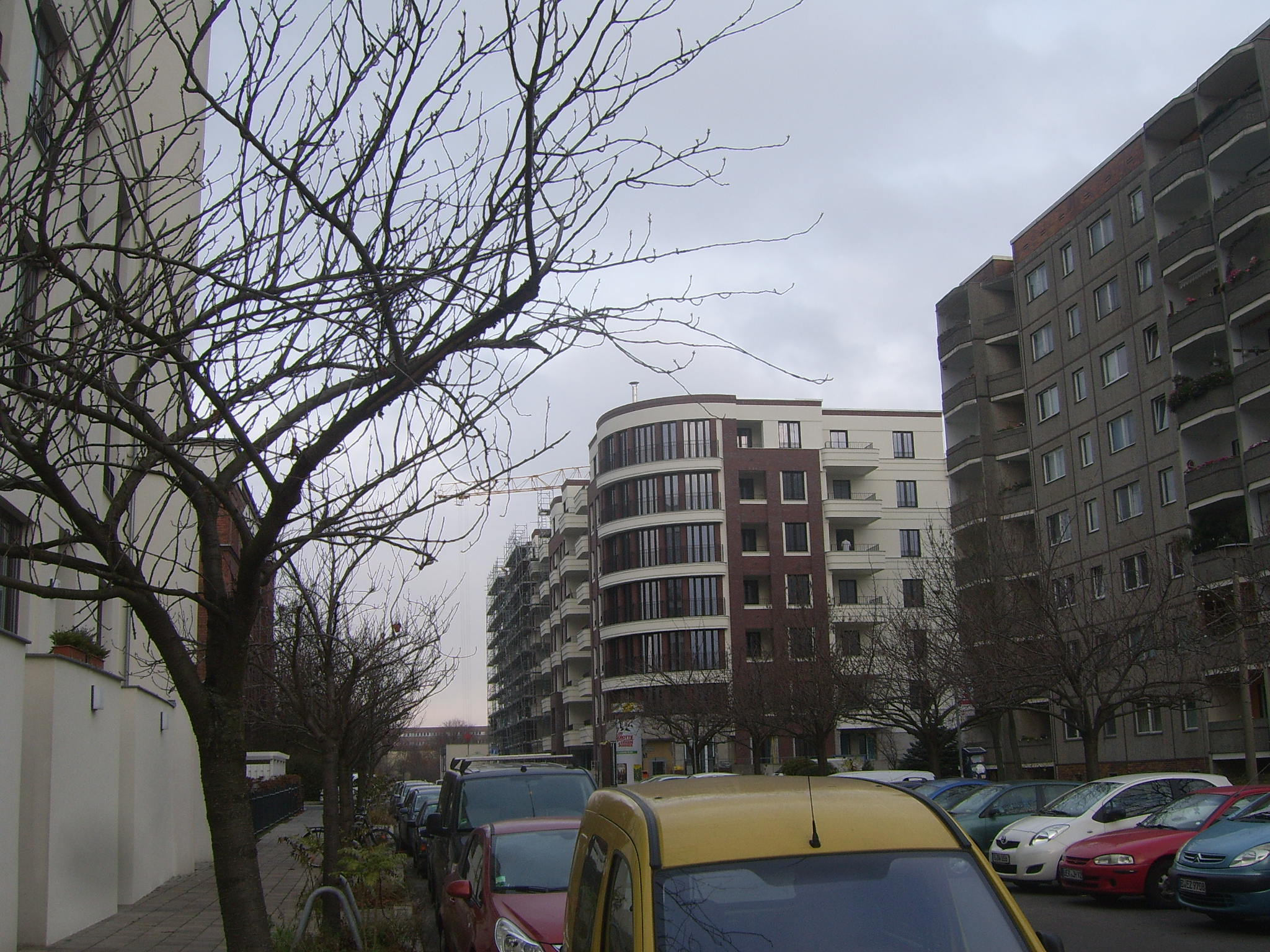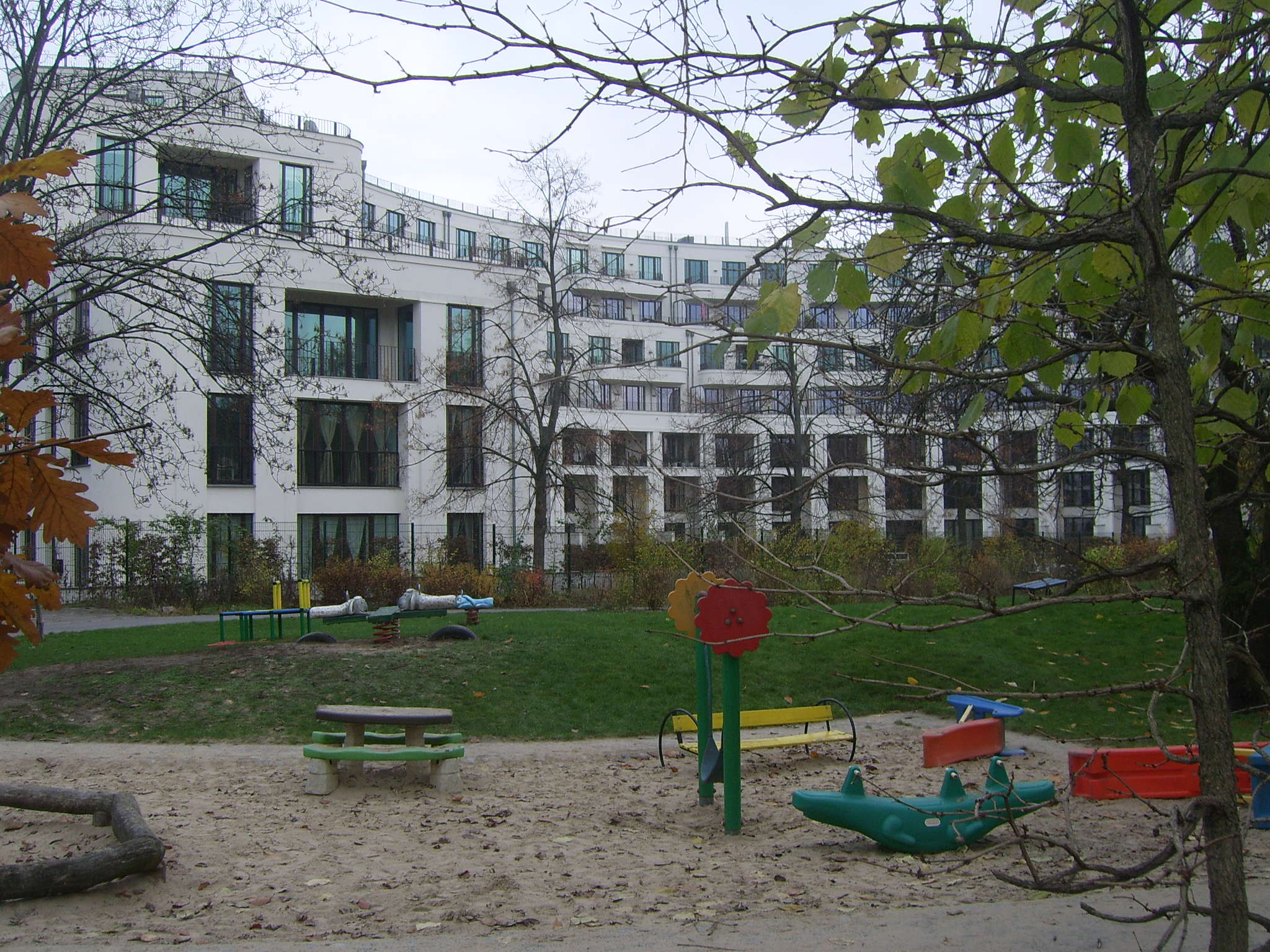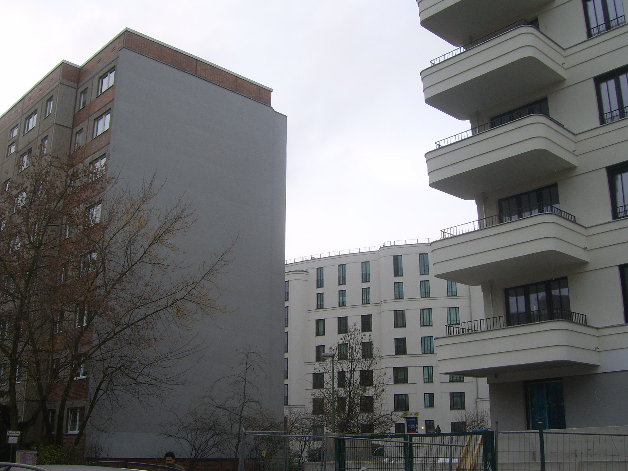 Drei große Bauvorhaben sind bzw. werden derzeit auf dem Areal verwirklicht. Der Prenzlauer Bogen thront als Gate Community gegenüber dem Krankenhaus. Er wirkt wie ein Sanatorium des Bundesnachrichtendienstes. Man bleibt mehrheitlich unter sich, nur verängstigte Gassirunden mit dem überzüchteten Rassehund werden gewagt. Die Kinder bleiben im umzäunten Areal, Kontakt zu Nachbarn wurde noch nicht beobachtet. Aber es gibt sie auch, die Familien, die sich im Bogen eingemietet haben, die sich, wie Andere auch, nach Kontakten zu ihrer Umwelt sehnen und sich durchaus im Kiez integriert haben. Denen möchte ich ihre vom Architekten gewollte Abgrenzung nicht vorwerfen. Dennoch ist es für sie schwer, aus dem vorgegebenen elitären Panzer heraus zu brechen.
